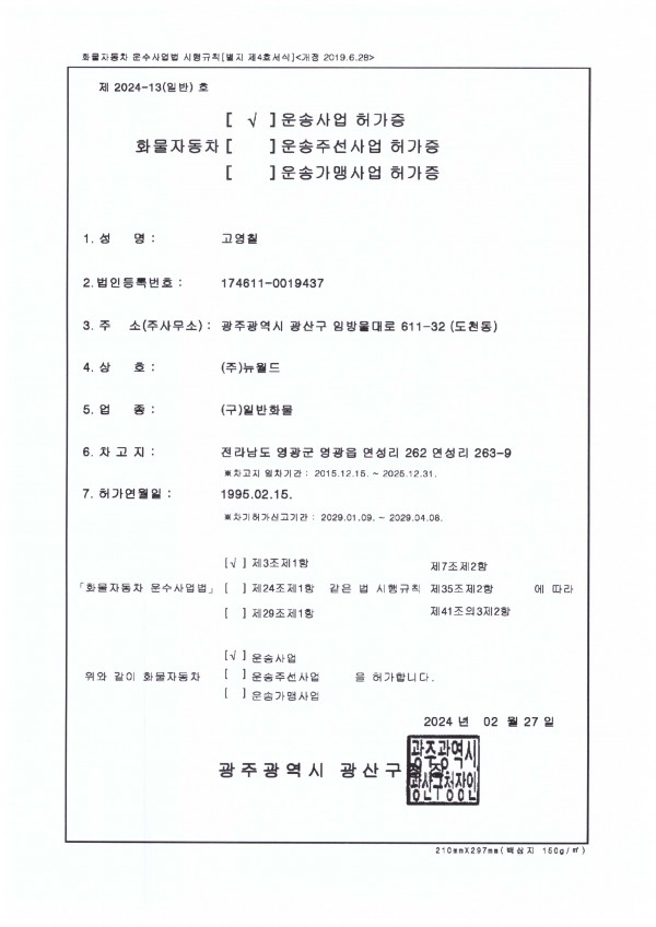 화물자동차운송사업허가증 화물자동차운송사업허가증(뉴월드_일반) 페이지 정보 작성자 월드냉동 댓글 0건 조회 11회 작성일 26-03-10 20:03 본문 화물자동차운송사업허가증(뉴월드_일반) 목록 이전글화물자동차운송사업허가증(심호시스템_개인) 26.03.10 다음글화물자동차운송사업허가증(뉴월드_개인) 26.03.10