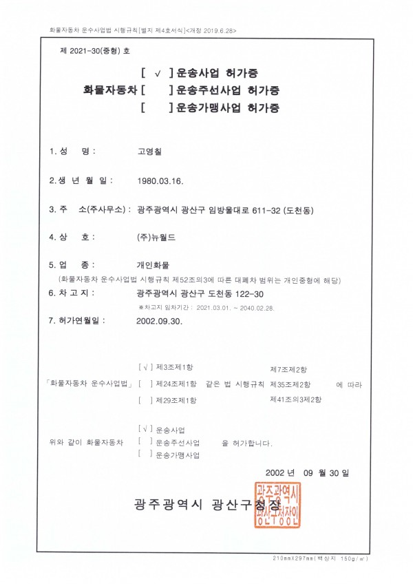 화물자동차운송사업허가증 화물자동차운송사업허가증(뉴월드_개인) 페이지 정보 작성자 월드냉동 댓글 0건 조회 4회 작성일 26-03-10 20:03 본문 화물자동차운송사업허가증(뉴월드_개인) 목록 이전글화물자동차운송사업허가증(뉴월드_일반) 26.03.10 다음글축산물운반(한울물류) 26.03.10